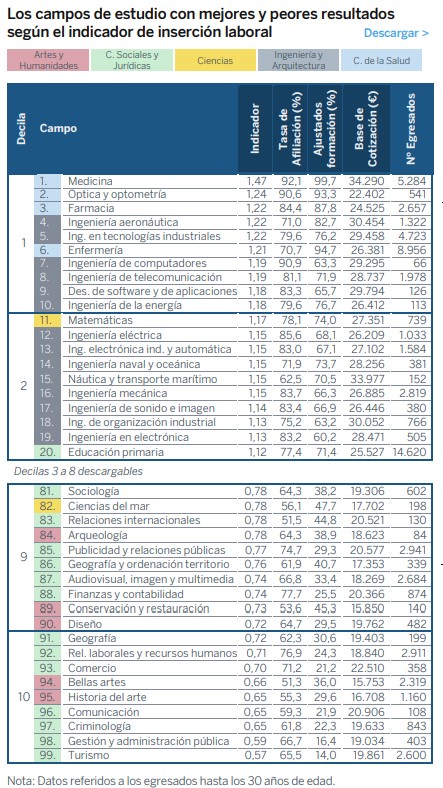Así, el índice de las disciplinas con mejor inserción triplica al de las situadas en la cola. El ranking lo encabezan las ciencias de la salud (Medicina, Enfermería y Óptica), con un 72% de inserción laboral por encima de la media, las ingenierías (78%) (Aeronáuticas y Telecomunicación, entre otras) y Matemáticas y Educación Primaria, que aparecen en posiciones avanzadas.