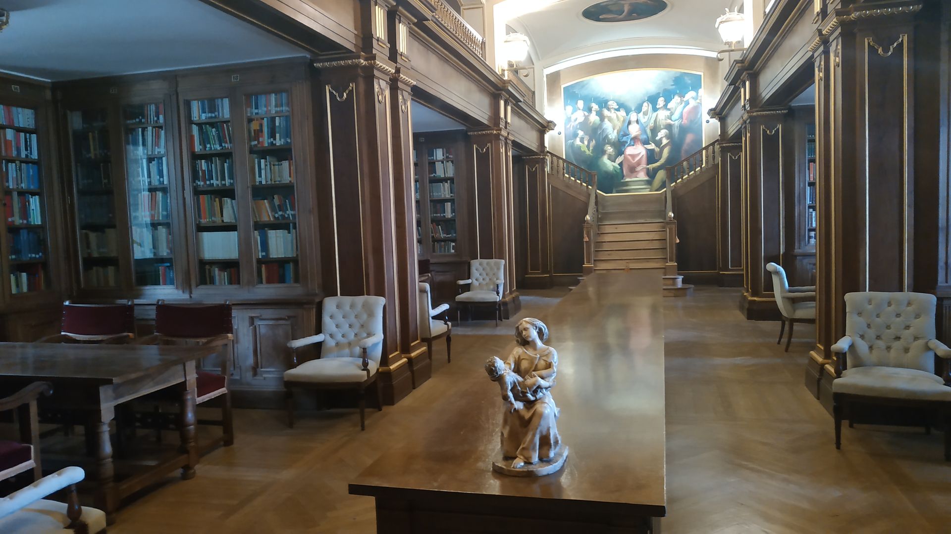 25.000 libros reposan en las estanterías de nogal. "Estos ejemplares fueron recogidos tras la Guerra Civil. De aquí emanaban leyes. Hasta la biblioteca venían a estudiar dirigentes de los años 50 y 60 para conocer cómo llevar la economía de España al crecimiento y prosperidad. También, se pretendía culturizar a los españoles para que no se volviera a caer en una Guerra Civil. Yo no soy franquista ni antifranquista, en el Valle se cuenta la historia como fue no como la manipula la izquierda. Los monjes aquí rezan por los dos bandos y por la unidad de España, ¡y a diario!", asiente el hotelero.