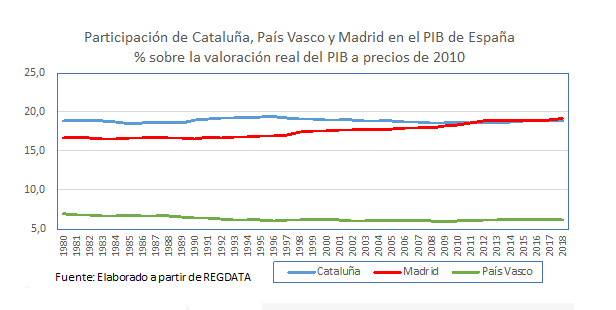 Todo esto ha cambiado el mapa económico regional de España, muy lentamente, eso sí, pues en la economía no suele haber revoluciones y las mutaciones se configuran poco a poco, siguiendo unos impulsos que apenas son perceptibles en el corto plazo, pero que resultan inexorables y muchas veces irreversibles en el largo plazo. Es lo que se puede observar en el gráfico de arriba, donde se refleja el papel de Cataluña, Madrid y el País Vasco en la economía española a lo largo de esos casi cuarenta años a los que antes me he referido. Y ahí se ve con claridad que durante la década de 1980 tanto Cataluña como Madrid tuvieron estabilizada su participación en la economía española, cosa que no ocurrió en el País Vasco –que la redujo, aunque sólo un poco–. Pero con la llegada de los noventa Cataluña mejoró su posición relativa mientras Madrid apenas se movió y el País Vasco entró en una trayectoria decadente. A mediados de los noventa Madrid empezó a repuntar –seguramente debido al impulso que imprimió a su economía el cambio político propiciado por la sustitución de Joaquín Leguina (PSOE) por Alberto Ruiz Gallardón (PP)–, y ello le introdujo en un recorrido incremental que llega hasta nuestros días. En cambio, en Cataluña –que con el mencionado Pacto del Majestic aumentaba su influencia sobre la política nacional– pasó lo contrario, de manera que hasta ya entrada la crisis financiera de la primera década del siglo XXI perdió posiciones en España. En 2011 el PIB madrileño se igualó con el catalán, y desde entonces Madrid se configuró como la primera región española por su tamaño económico. El motor económico de España se residenció en el centro de la península, dejando a Cataluña en el segundo plano con una participación estabilizada. Entretanto, el País Vasco, con el final del terrorismo, dejó de perder cuota e inició un lentísimo avance que, a día de hoy, solo le ha permitido recuperar una décima parte de lo que en todos estos años dejó por el camino.