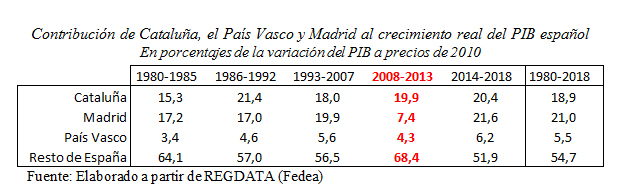 El lector puede comprobar que, en el conjunto del período, la contribución de Cataluña al crecimiento español se cifró en el 18,9 por ciento, un poco por debajo de la de Madrid y, lógicamente –por ser una región muy pequeña– muy por encima del País Vasco. Cataluña y Madrid son regiones importantes para la economía española, aunque no se puede olvidar que la España identificada residualmente en el cuadro aportó más de la mitad de ese crecimiento –concretamente, el 54,7 por ciento–. Durante la primera etapa (1980-1985, que corresponde a la salida de la crisis industrial que provocó la subida de los precios del petróleo tras la guerra del Yom Kipur), la aportación catalana y la vasca fueron mínimas, no en vano ambas regiones se vieron severamente afectadas por la desindustrialización, algo que también se produjo en Madrid, aunque menos intensamente por estar su economía más diversificada hacia los servicios. Pero esto se corrigió en los años siguientes (1986-1992), en los que España se integró en la Comunidad Europea, de manera que Cataluña contribuyó al crecimiento español por encima de su participación en el PIB; y lo mismo pasó con Madrid, aunque muy atenuadamente; pero no con el País Vasco, donde los efectos del terrorismo lastraron su dinámica económica. Como los lectores saben, 1992 se cerró con una severa crisis de pagos internacionales que condujo a tres devaluaciones sucesivas de la peseta, lo que sirvió para recuperar la competitividad perdida en los años precedentes –gracias a la insensata política de sobrevaluación cambiaria que propició el ministro socialista Carlos Solchaga– y, de esa manera, entrar en una larga etapa de crecimiento que se vio, además, favorecida por el ingreso de España en la zona del euro. En esta última (1993-2007) Cataluña redujo claramente su dinamismo y sólo pudo aportar el 18 por ciento al crecimiento español, ahora por debajo de su tamaño económico relativo. Sin embargo, el País Vasco mejoró algo su rendimiento –pero aguantando todavía el lastre del terrorismo–, mientras Madrid lo hacía con un ímpetu imparable que situó su contribución más de dos puntos por encima de su tamaño regional, superando a Cataluña –algo que, desde entonces, se ha convertido en una constante hasta nuestros días–. Pero entonces se desencadenó la crisis financiera y la economía española vio decrecer su PIB real en casi 100.000 millones de euros entre 2008 y 2013. Las cifras de Cataluña fueron en esta época muy negativas y, por ello, aumentó su participación porcentual a la regresiva trayectoria nacional, cosa que no ocurrió ni con el País Vasco ni, sobre todo, con Madrid, pues en estas regiones la caída del PIB fue mucho más moderada. Y llegada la recuperación post-crisis (2014-2018) los números se arreglaron para todos, pero ha de anotarse que Madrid siguió superando a Cataluña en cuanto a su aportación al crecimiento español; y que el País Vasco, ya libre del terrorismo, contribuyó –en este caso, por primera vez– por encima de su participación en el PIB nacional.