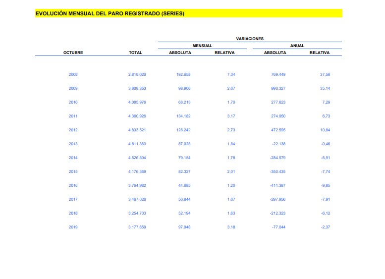 La única parte positiva de las cifras que han salido hoy a la luz es que la Seguridad Social cerró octubre con un aumento medio de 106.541 afiliados (+0,5%), su segundo mejor dato en este mes dentro de la serie histórica tras el logrado el año pasado, cuando se ganaron 130.360 ocupados. Pero estos datos hay que cogerlos con prudencia, ya que se explican por el aumento de las contrataciones del sector público, más concretamente, del ámbito de la educación debido al inicio del curso escolar. En términos interanuales la afiliación sí registra una aumento en 436.920 personas, lo que, aunque es una tasa positiva refleja una ligera caída y se sitúa en el 2,30%.