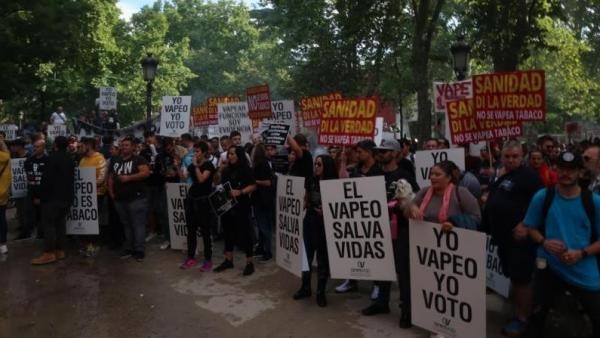 Más de un centenar de vapeadores se concentraron en septiembre ante el organismo para pedir la dimisión de la ministra del mismo, María Luisa Carcedo, por la "campaña de desinformación" sobre los cigarrillos electrónicos, que "salvan vidas", ya que ayudan a abandonar el tabaco.
