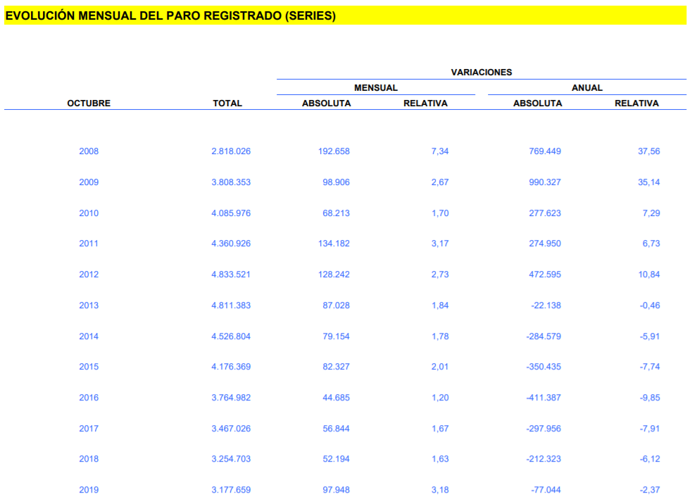 Octubre suele saldarse, habitualmente, con un repunte del paro debido a la finalización de los contratos veraniegos, pero la clave, en este caso, es que los servicios públicos de empleo (antiguo Inem) acaban de anotarse el peor registro en este mes desde el fatídico 2012, cuando España todavía estaba en plena tormenta financiera. En concreto, el desempleo subió en 97.948 personas (+3,2%), el doble que el pasado año (+52.194) y el mayor alza desde 2012, cuando aumentó en 128.242.
