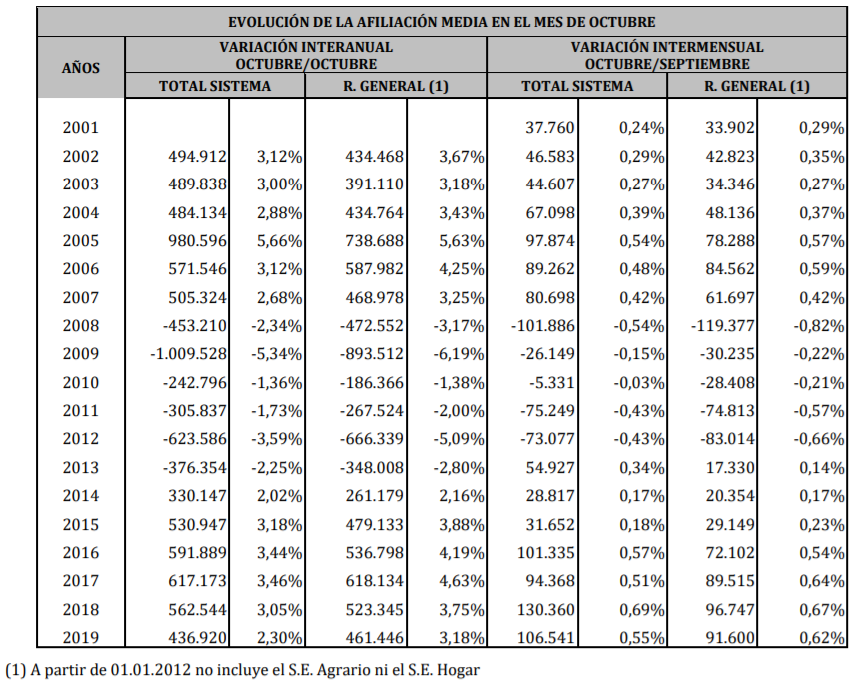 Pese a todo, lo más importante no es el paro en sí, sino la creación de empleo, y el problema es que también se está frenando. La Seguridad Social cerró octubre con un aumento medio de 106.541 afiliados (+0,5%), hasta un total de 19.429.993 ocupados.