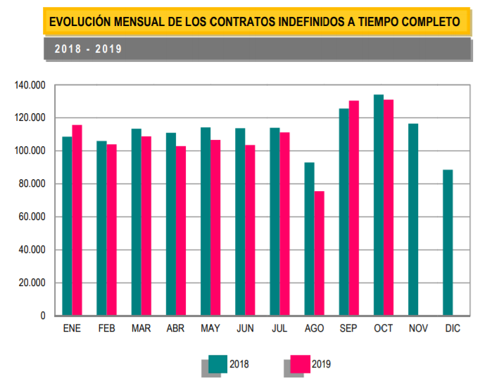 Por último, pese a que el Gobierno de Sánchez incide mucho en la necesidad de combatir la precariedad, los resultados obtenidos tampoco acompañan en esta materia. En octubre, se firmaron un total de 237.866 contratos indefinidos, un 1,84% menos que hace un año. En lo que va de ejercicio, el empleo indefinido acumula un total de 1,84 millones de contratos, un 4,8% menos que en el mismo período de 2018. Los contratos indefinidos a tiempo completo bajan en 8 de los 10 meses de 2019.