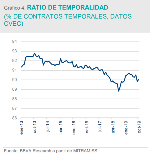 Excluidos el efecto calendario y la estacionalidad, se observa que la contratación indefinida cae un 1,7% respecto a septiembre, mientras la temporal aumenta un 0,3%, por lo que la ratio de temporalidad crece dos décimas, volviendo a superar el 90%, tal y como destaca BBVA Research. En definitiva, el mandato de Sánchez se está saldando con más paro, menor creación de empleo y mayor precariedad laboral.