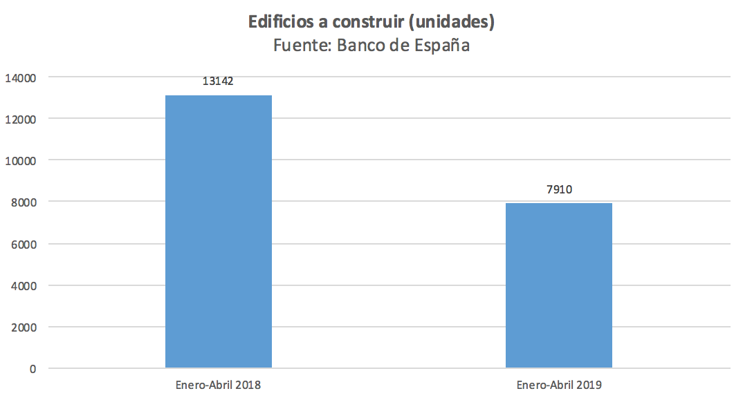 Empecemos por los datos definitivos para el primer cuatrimestre del año, ofrecidos por el Banco de España. Según dicha base estadística, el total de edificios a construir alcanzó las 13.142 promociones entre enero-abril de 2018, una cifra muy superior a las 7.910 unidades que se pusieron en marcha en el mismo periodo de 2019. Estamos, pues, ante una corrección del 40%.