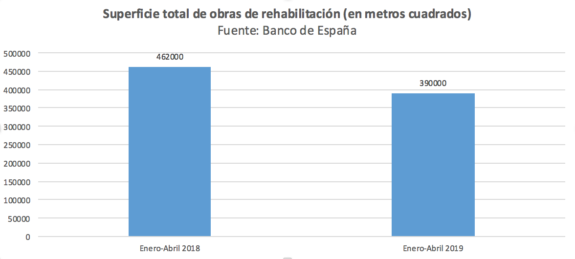 Más allá de la obra nueva, las obras de rehabilitación experimentan también una franca reducción. Este tipo de proyectos abarcaron en el primer cuatrimestre de 2018 un total de 462.000 metros cuadrados, mientras que la superficie total de las obras realizadas entre enero y abril de 2019 se reducen a un tamaño acumulado de 390.000 metros cuadrados. Un desplome del 16%.