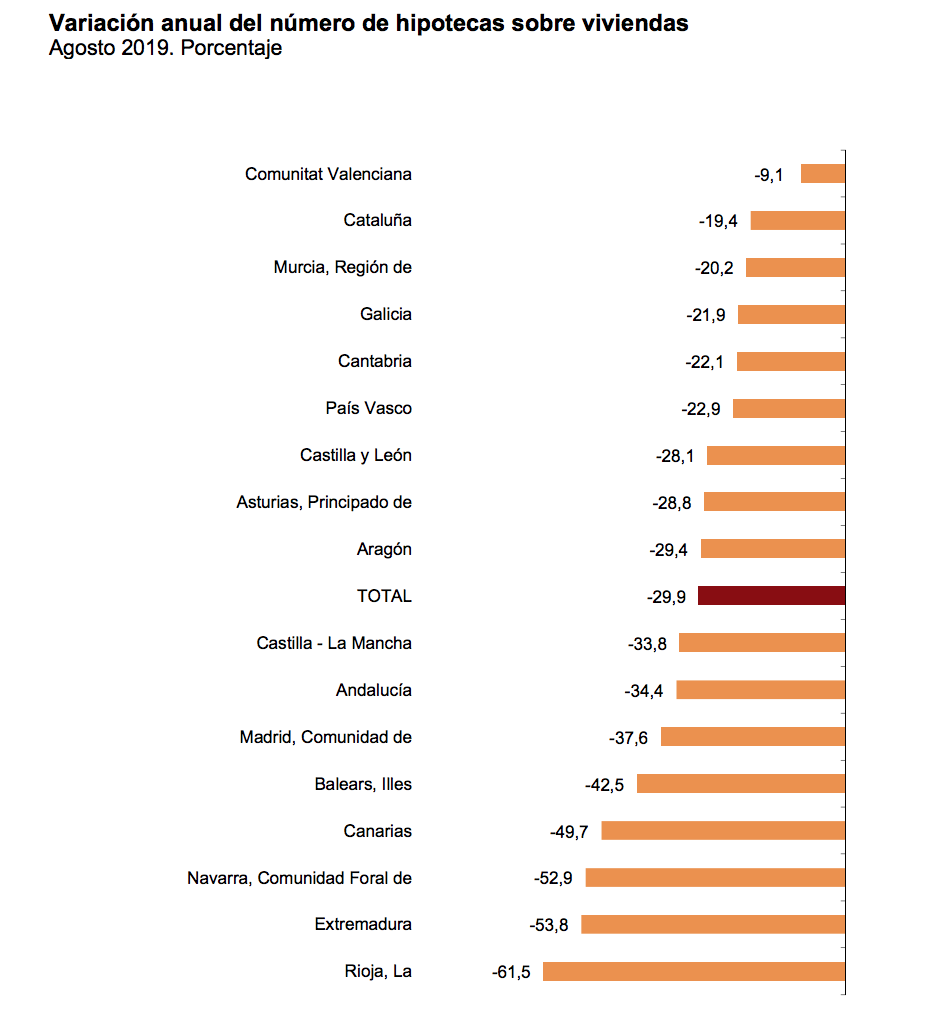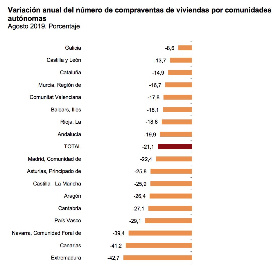 Estos datos se traducen ya en una caída de las operaciones de adquisición de vivienda. Según el boletín de Transmisiones de Derechos de la Propiedad, elaborado también por el Instituto Nacional de Estadística, el pasado mes de agosto se alcanzó ya una corrección del 21,1% en la compra-venta residencial.