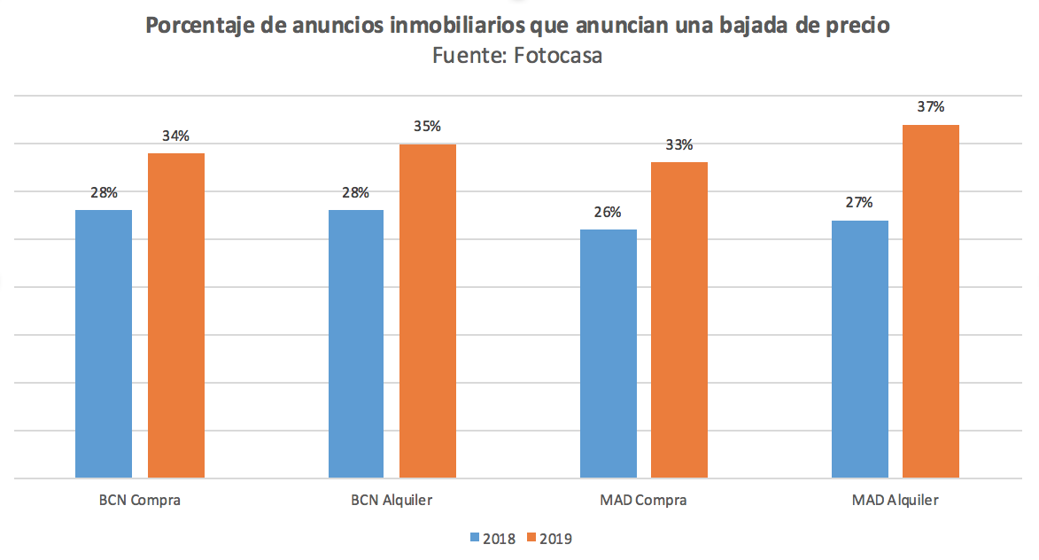 En la misma línea van los datos que maneja Fotocasa, cuya base de datos es especialmente rica en el mercado madrileño y barcelonés, donde abarca miles de inmuebles de segunda mano. Según las estadísticas del portal inmobiliario, el número de pisos que han aplicado rebajas en el precio de venta ha subido del 28% al 34% en Barcelona y del 26% al 33% en Madrid. En el segmento de alquiler, el crecimiento en el porcentaje de anuncios con rebaja es del 28% al 35% en la Ciudad Condal y del 27% al 37% en la Villa y Corte.