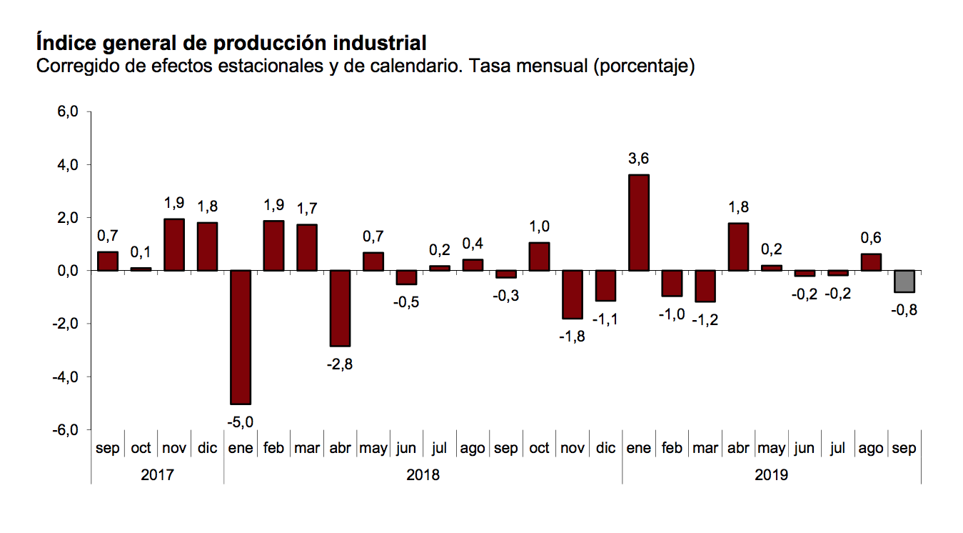 Un buen ejemplo del rumbo negativo que sigue la economía es el Índice de Producción Industrial, que muestra cómo el sector secundario sufrió en septiembre una caída del 0,8%. Por comparación, en el mismo mes de 2017 se produjo una mejora del 0,7% en este indicador, mientras que en 2018 se observó una caída del 0,3%.