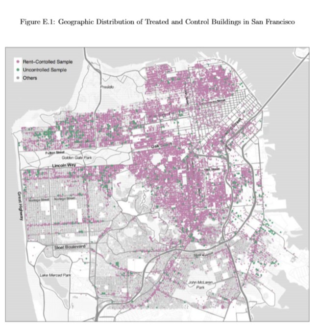 También hallan que el 42% de las pérdidas en bienestar debido a la menor producción y menor cantidad de arrendamientos recaen sobre residentes de San Francisco que no vivían en la ciudad en el año 1993. Los beneficiarios del control de alquileres, es decir, quienes realmente consiguen pagar un precio más bajo por ellos que antes de la reforma, tienen entre un 10% y un 20% más de probabilidades de mantener su residencia en el mismo apartamento que aquellos perjudicados por la política, los que tienen que pagar más. En el mapa inferior se pueden apreciar las zonas de San Francisco bajo el control de alquileres.