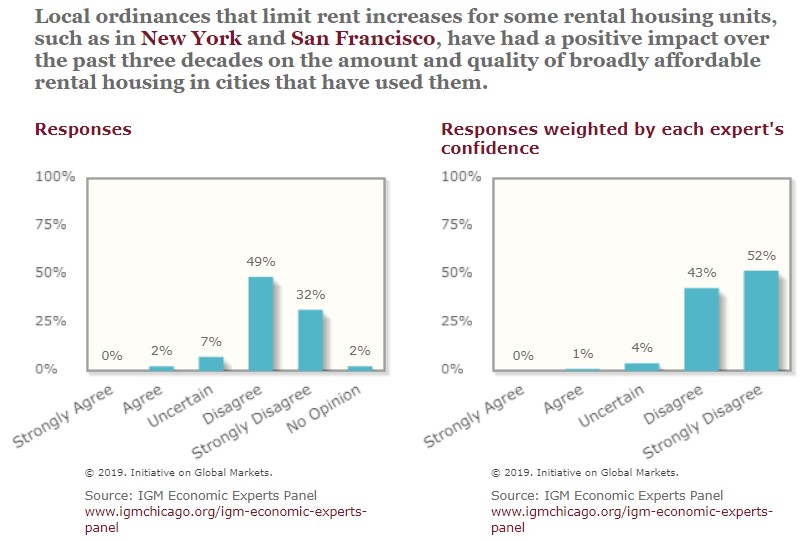 La opinión de los economistas también es relevante para entender el fracaso de esta medida intervencionista. En 2012, la escuela de negocios Chicago Booth preguntó a varios expertos si las medidas que limitaban el aumento del precio del alquiler habían tenido un efecto positivo en las últimas tres décadas sobre la cantidad y calidad de las viviendas disponibles en alquiler en las ciudades que las han implementado. Valiendo todas las respuestas lo mismo, solo el 2% estuvo de acuerdo. Ordenando el valor de las respuestas por la confianza en los expertos consultados, solo el 1% afirmó estar de acuerdo.