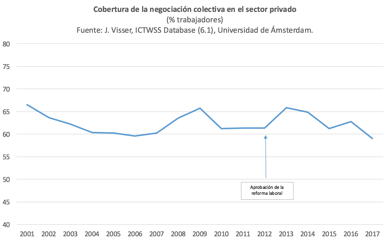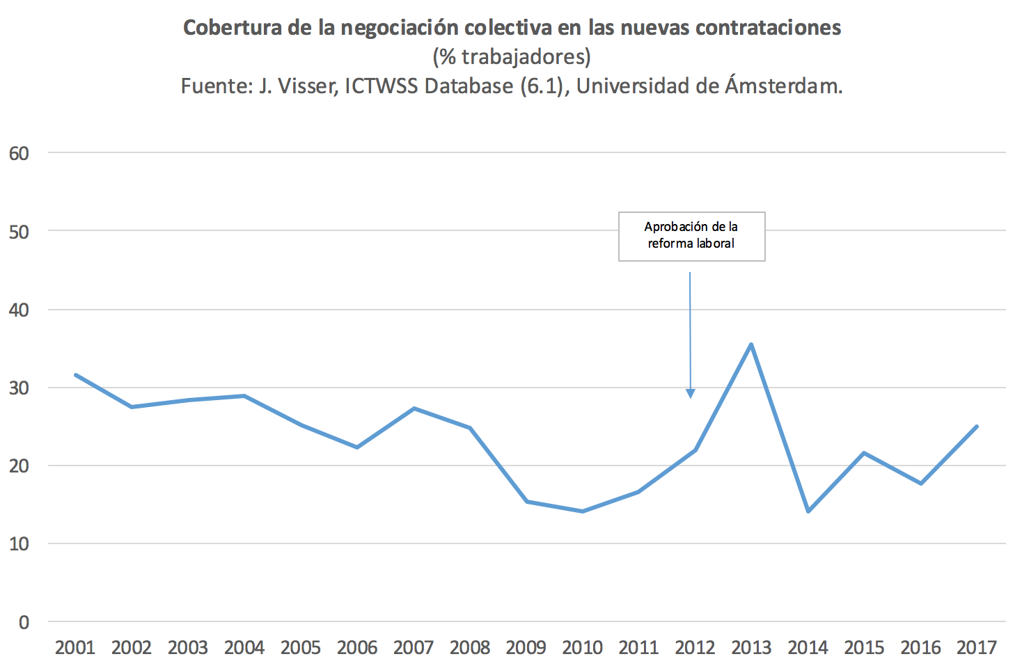 Lo podemos ver en los tres siguientes gráficos, que documentan el peso de la negociación colectiva sobre el total de trabajadores, sobre el total de nuevos contratos firmados y sobre el total de ocupados del sector privado. Las tres variables acreditan que no ha habido cambios significativos desde 2012, tumbando el último mito de los enemigos de la reforma laboral. Son datos de la Organización Mundial de Trabajo, tratados por la Universidad de Ámsterdam y mediados por sindicatos de todo el mundo.