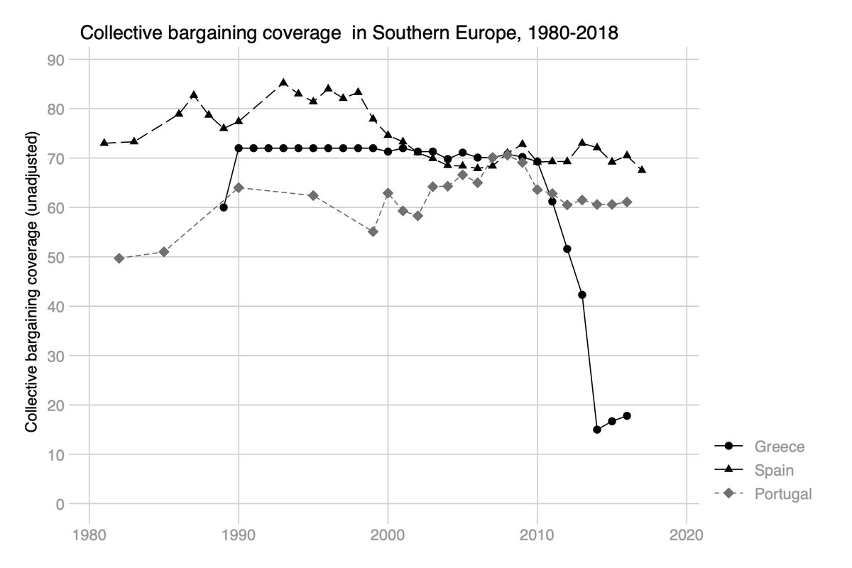 De hecho, si se compara la cobertura de la negociación colectiva en España con otros países del Sur de Europa gobernados por la izquierda, como Portugal o Grecia. Haciendo este ejercicio podemos ver que nuestro país es el que más prevalencia da a este tipo de acuerdos, diez puntos porcentuales por delante de nuestros vecinos lusos y cincuenta puntos porcentuales por encima de la situación del país heleno.