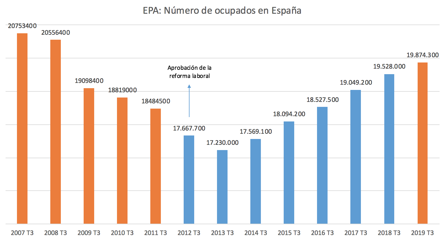 Sin embargo, los datos de la Encuesta de Población Activa muestran que la evolución del mercado de trabajo fue muy positiva desde que el Gobierno popular apostó por esta reforma, puesto que el nivel de ocupación observado en el tercer trimestre de 2019 asciende a 19.874.300 personas, frente a las 17.667.700 del mismo periodo de 2012.