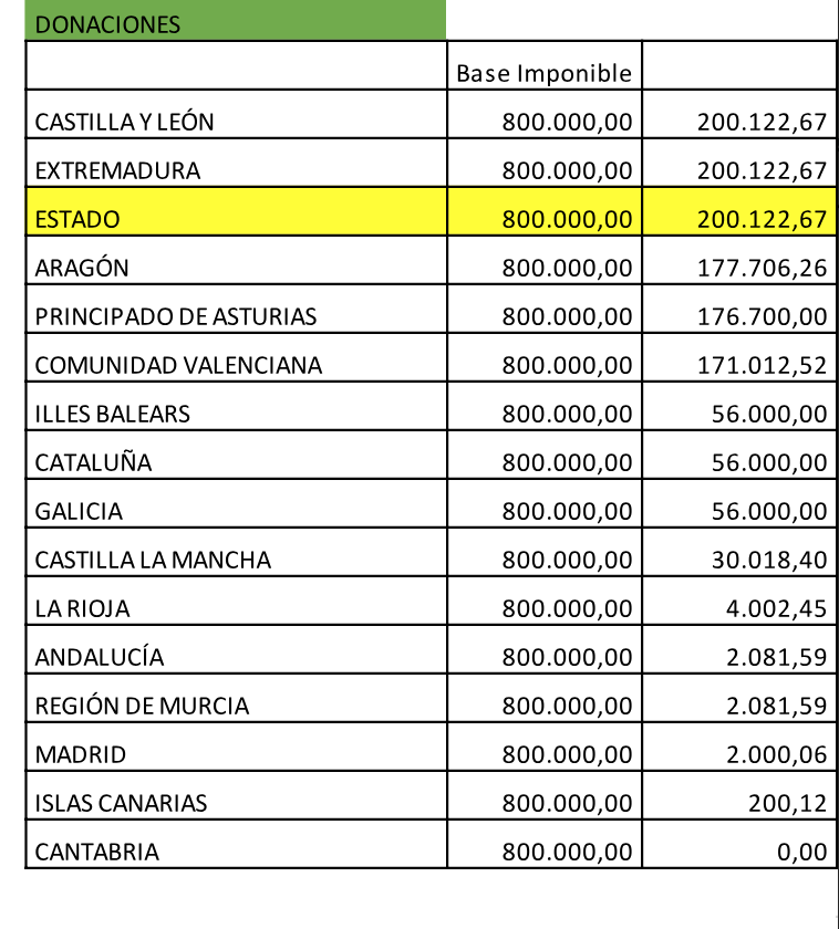 El mismo caso se da con el Impuesto de Donaciones en el supuesto de un hijo de 30 años recibe de su padre 800.000 euros en dinero en efectivo sin un destino específico y sin que tenga ningún grado de discapacidad. Cantabria, Canarias, Madrid, Andalucía, Murcia y la Rioja pagarían casi 200.000 euros más por esa donación con la normativa estatal. En el lado contrario están Castilla y León y Extremadura, que pagarían exactamente lo mismo, y Aragón, Asturias o Valencia, que apenas notarían la diferencia debido a los impuestos tan altos que tienen actualmente.