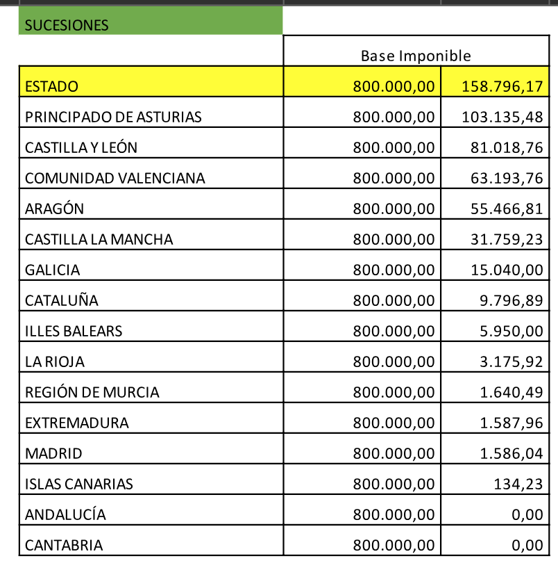 Así, mientras que a día de hoy esa herencia en Andalucía o en Cantabria no tributaría nada, la tarifa estatal obligaría a los contribuyentes a pagar la friolera de 158.796 euros si se llega a imponer. Para los madrileños, extremeños, canarios y murcianos también supondría un sablazo de más de 150.000 euros.