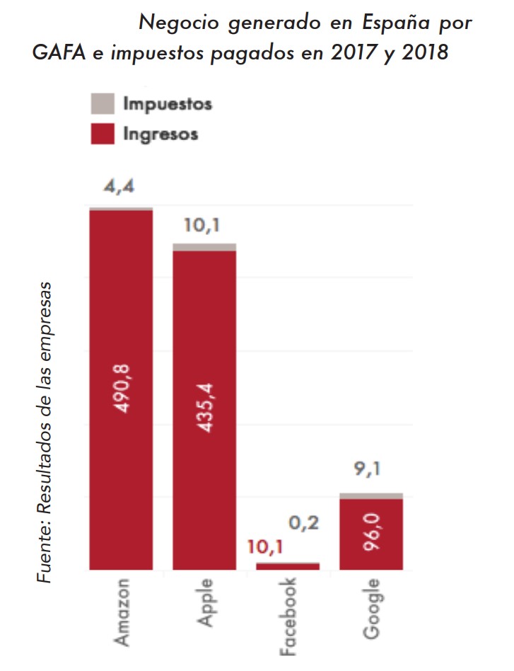 Las dos cosas son ciertas. Por un lado, es evidente que las grandes empresas tecnológicas han sabido aprovecharse de las ventajas de la nueva economía y las peculiaridades de su negocio para pagar impuestos en aquellas jurisdicciones en las que se penaliza menos la creación de riqueza (por ejemplo, en la UE, Irlanda). También han aprendido a utilizar con tino los trucos de los diferentes impuestos de sociedades, con un manejo de las operaciones intragrupo con el que logran que todos los beneficios acaben en la sede central o en la filial más adecuada (esos precios por servicios entre empresas relacionadas que siempre terminan resultando tan convenientes a efectos fiscales). No hay nada ilegal en ello ni tampoco hay nada que no haga el 99% de los contribuyentes en los tributos que le toca abonar (intentar aprovechar las disposiciones legales para pagar el mínimo posible). Pero al Gobierno y a sus socios les fastidia que estas grandes multinacionales sean tan relevantes y, al mismo tiempo, paguen tan pocos impuestos, según su criterio, en España (ver imagen de la derecha, tomada del informe de Civismo El coste de los nuevos impuestos).