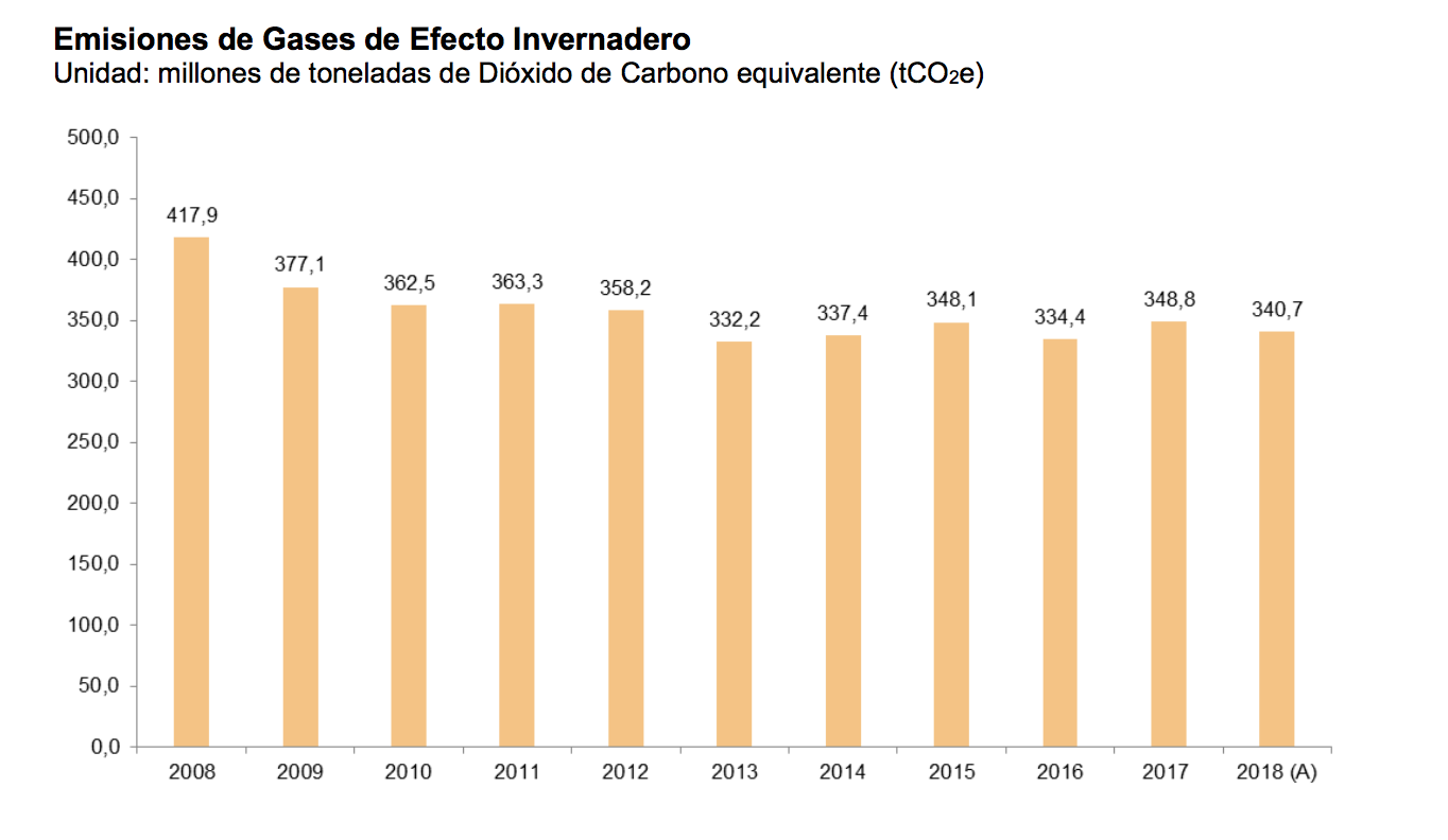 Midiendo las emisiones en toneladas de dióxido de carbono equivalente (tCO2e), encontramos que los niveles registrados en 2008 ascendían a 417,9 millones, muy por encima de las 340,7 que se registraron en 2018, el último año con datos disponibles. El dato del curso pasado representa, además, una caída del 2,3% respecto a 2017.
