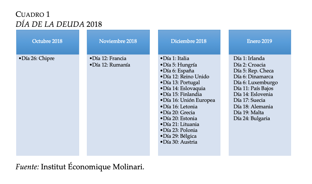 Tal fecha queda marcada como el Día de la Deuda. Este cálculo, realizado por el Instituto de Estudios Económicos en colaboración con el Instituto Económico Molinari de Francia, permite visibilizar el problema del excesivo endeudamiento de las Administraciones Públicas a partir de un simple ejercicio, que consiste en traducir el saldo presupuestario a un calendario.