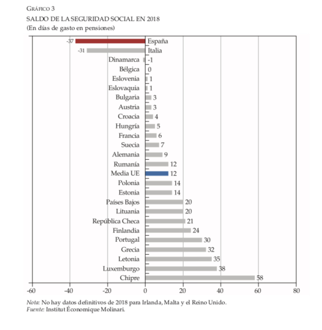 Por el contrario, Chipre registra un superávit equivalente a 58 días de gasto en pensiones, mientras que Luxemburgo, Letonia, Grecia, Portugal, Finlandia, República Checa, Lituania y Países Bajos consiguen un saldo positivo superior a los 20 días. La media europea es de 12 días, mientras que Alemania está en 9, Suecia en 7 o Francia en 6.