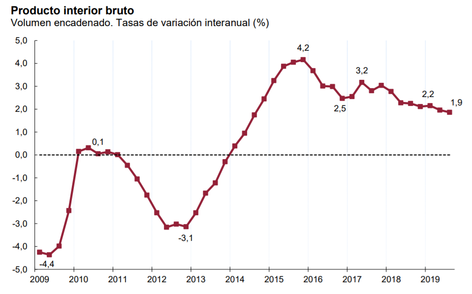 España crece hoy a una tasa inferior al 2%, muy lejos del 3% registrado hasta hace apenas dos años. En concreto, el PIB avanzó un 1,9% interanual en el tercer trimestre, según los últimos datos publicados por el Instituto Nacional de Estadística (INE).