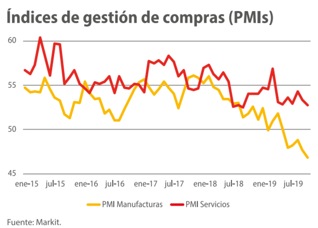 A esta señal de debilidad se suma el hecho de que la actividad del sector privado registró el pasado octubre su nivel más débil en casi seis años, especialmente en el ámbito de las manufacturas, que se encuentra en contracción (por debajo de 50 puntos), según los últimos Índices de Gestión de Compras.