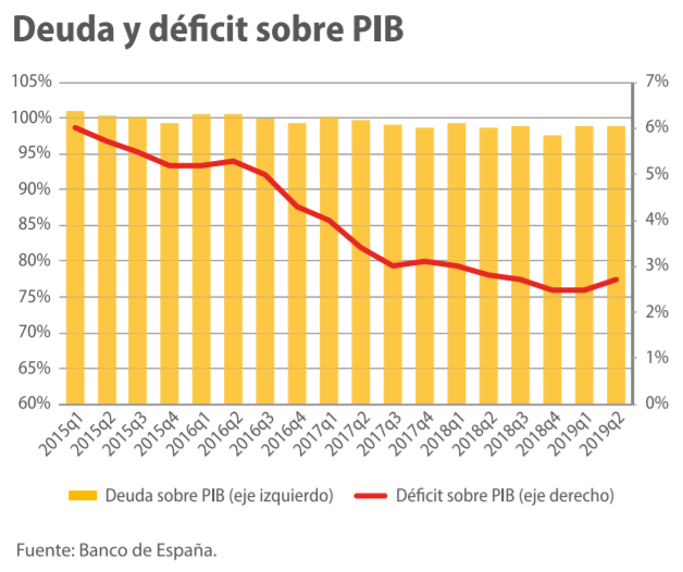 Como resultado, el déficit público aumentaría. España cerró 2018 con un agujero del 2,5% del PIB y todo apunta a que este año alcanzará una cifra similar, por encima del 2%. Si el gasto, lejos de frenarse, se intensifica, este desequilibrio aumentará, en un contexto financiero muy delicado, ya que la deuda pública roza el 100% del PIB. Cualquier alza relevante de los tipos de interés o la aparición de nuevas turbulencias en los mercados financieros volvería a poner en aprietos la solvencia del Estado.