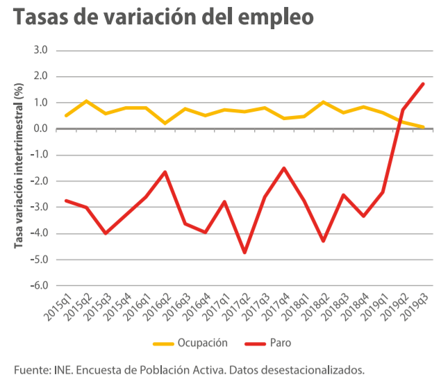 No en vano, la ocupación apenas avanzó en 69.400 personas en el tercer trimestre, según la última Encuesta de Población Activa, frente a las 183.900 del mismo periodo del año anterior y las 235.900 de 2017. Como resultado, la reducción en la tasa de paro prácticamente se ha estancado y, a corto y medio plazo, corre el riesgo de subir.