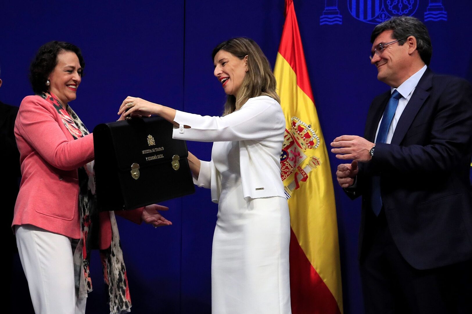 Máxima expectación en la sede del Ministerio de Trabajo para ver a Yolanda Díaz y José Luis Escrivá recibir sus nuevas carteras como ministros. En una sala atestada de políticos, familiares, sindicalistas, periodistas y… algún que otro empresario, todo han sido felicitaciones para los recién llegados a un ministerio que, tras el pacto PSOE-Podemos, ha quedado dividido en dos. Por un lado estará Trabajo, con Yolanda Díaz al frente, y por el otro, Seguridad Social, con José Luis Escrivá.
