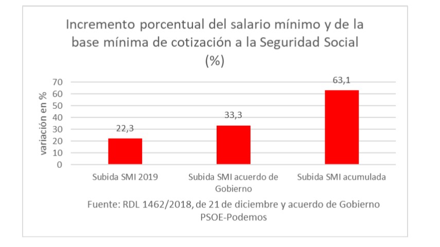 Con este nuevo incremento del salario mínimo hasta los 1.200 euros, Sánchez lo habrá elevado un 22,3% de 2018 a 2019, y un 33,3% de 2019 hasta el momento en el que aplique la subida recogida en el pacto con Podemos. Con ello, la subida acumulada del salario mínimo será de un 63,1% desde los 735,90 euros de 2018. Y así, sube también la base mínima de cotización a la Seguridad Social, encareciendo más los costes laborales y, por tanto, empeorando la productividad y la competitividad de las empresas españolas, que puede reducir sus ventas, y, con ello, la actividad económica y el empleo.