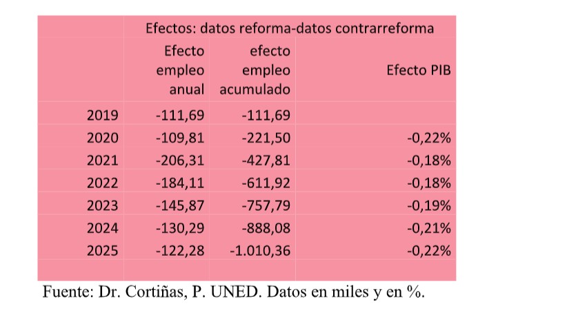 Cada año, así, dejarían de crearse más de 100.000 puestos de trabajo que sí podrían generarse de mantenerse la reforma laboral sin derogar, provocado por una pérdida anual de alrededor de 2 décimas de PIB. De esta forma, de aquí al final de la legislatura se habrán perdido 757.000 empleos, que superará el millón de puestos de trabajo destruidos en un entorno de cinco años.