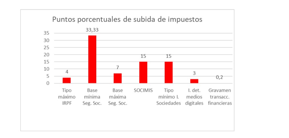 No sólo piensan aumentar el IRPF en varios puntos, que desincentivará a los trabajadores, especialmente a la parte de los mismos que más sostiene la recaudación (pues terminarán incrementándolo más que lo que aparece en el acuerdo, ya malo de por sí), sino que, además, impondrá un tipo mínimo del 15% en el tipo efectivo del Impuesto de Sociedades, por no hablar de la tasa para transacciones financieras, que perjudicará a la financiación en los mercados, o las tasas digitales o la ya aplicada repercusión del AJD a los bancos, que, tal y como el Banco de España ya detalló, está encareciendo los préstamos a los clientes, con lo que se ralentiza la expansión del crédito y, por tanto, el crecimiento económico. Como última perla de subida impositiva nos encontramos con un mayor gravamen a las SOCIMIS en la parte de beneficio no repartido, que dificultará la existencia de este tipo de sociedades, de manera que el mercado inmobiliario puede perder parte de su dinamismo, con las consecuencias en cascada que tendría sobre toda la economía. Todo esto, junto con el incremento de gasto, puede parar la actividad económica y provocar otro frenazo adicional en el empleo de medio millón de puestos de trabajo.