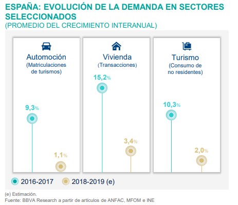 Según el informe la incertidumbre regulatoria y de seguridad jurídica ya está afectando de forma intensa y particular a sectores estratégicos como el del automóvil o el inmobiliario. Por otro lado el sector turístico muestra señales de agotamiento por la ralentización en el crecimiento de las economías de los países de origen de turistas y la recuperación de destinos alternativos afectados en el pasado por crisis geopolíticas.