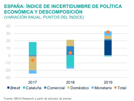 La repetición de elecciones, así como los vericuetos que ha tomado la negociación para la formación de un gobierno y la conformación final del Ejecutivo con comunistas y separatistas catalanes ha producido que "aumente" la incertidumbre "del componente doméstico". Una incertidumbre que se ha sumado a las que ha producido el Brexit. No obstante, el BBVA ve una oportunidad en que esta percepción ha sufrido un "desacople con la percepción de los mercados", lo que cree que se puede aprovechar para revertir la situación.
