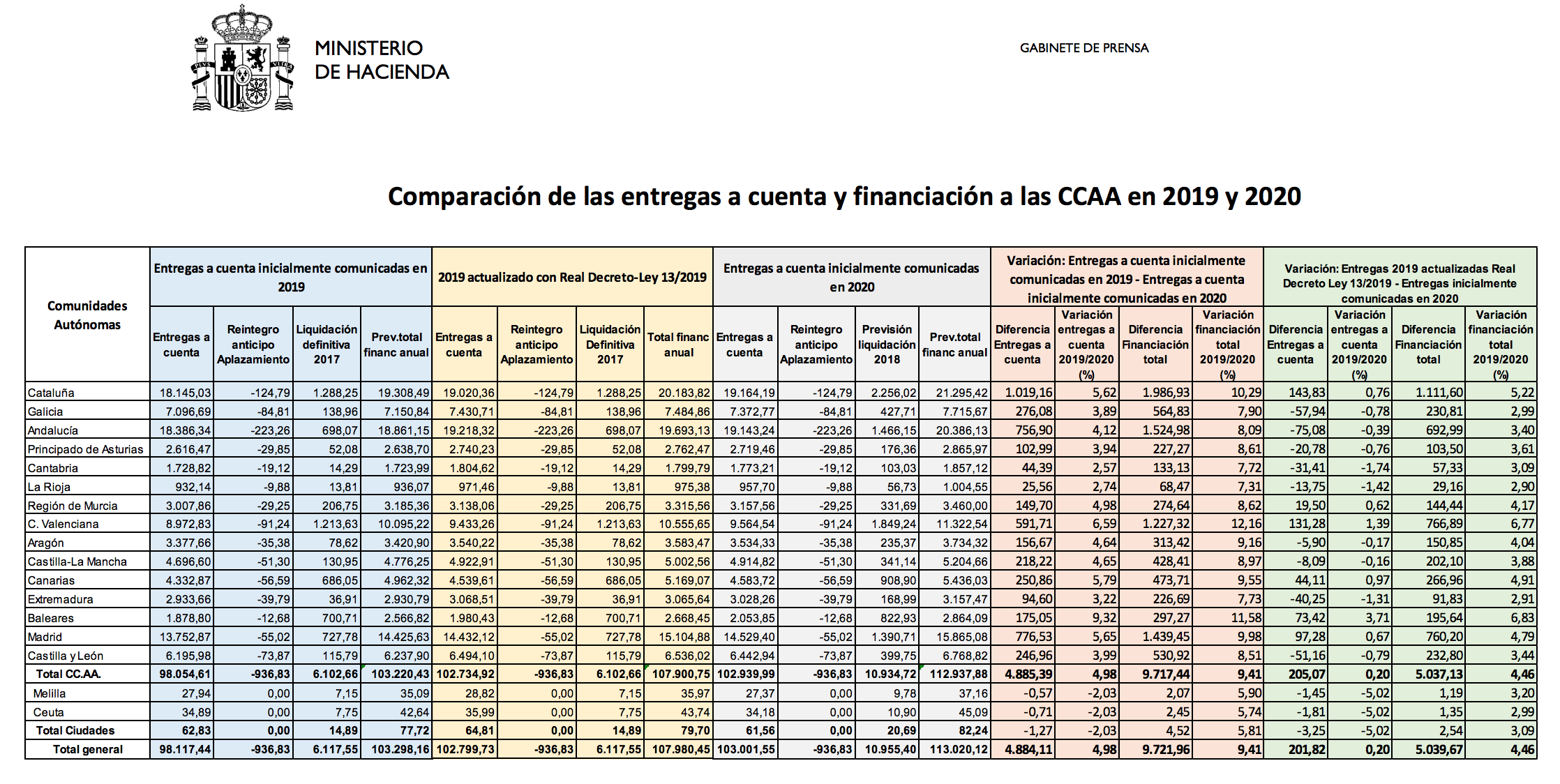 "Estas cuantías serán actualizadas cuando se conozcan las previsiones de ingresos del ejercicio en el marco del proceso de elaboración de los PGE", explica el Gobierno. Su versión es que "para los anticipos de 2020 se utilizará como base de cálculo el importe actualizado de 2019, en lugar de los valores de la prórroga de 2018, que habrían sido menores. De esta forma se consolidan los niveles de financiación que recibieron el pasado curso y se consigue que las Comunidades Autónoma y las Entidades Locales mantengan niveles similares a los resultados de las entregas a cuenta actualizada de 2019". Los territorios empezarán a recibir estos anticipos "en los próximos días".