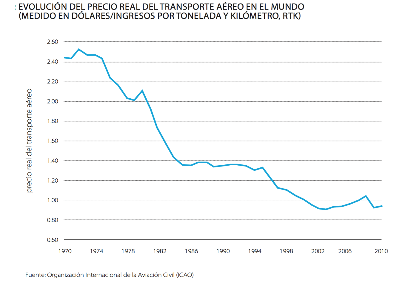 La competencia entre unas y otras compañías ha beneficiado directamente a los usuarios, puesto que el precio real del transporte aéreo, medido en relación con los ingresos por tonelada transportada y kilómetro recorrido, ha pasado de 2,4 a 1 dólar entre 1970 y 2010.