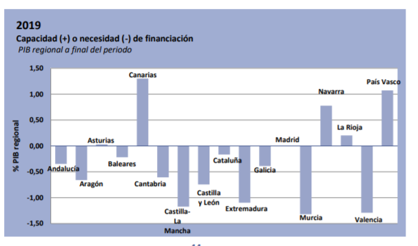 No es para menos. Con datos hasta noviembre, las comunidades autónomas han pasado de un superávit de 1.200 millones de euros en 2018 (0,1% del PIB) a un déficit de 3.125 millones en 2019 (-0,25% del PIB). Esto, teniendo en cuenta que diciembre tradicionalmente es un mes de pagar facturas atrasadas y, por lo tanto, el déficit se dispara, hace difícil conseguir el objetivo de déficit regional del -0,1% del PIB. Incluso, hay regiones como Valencia, Murcia, Extremadura y Castilla La Mancha que ya acumulan un déficit del 1%.