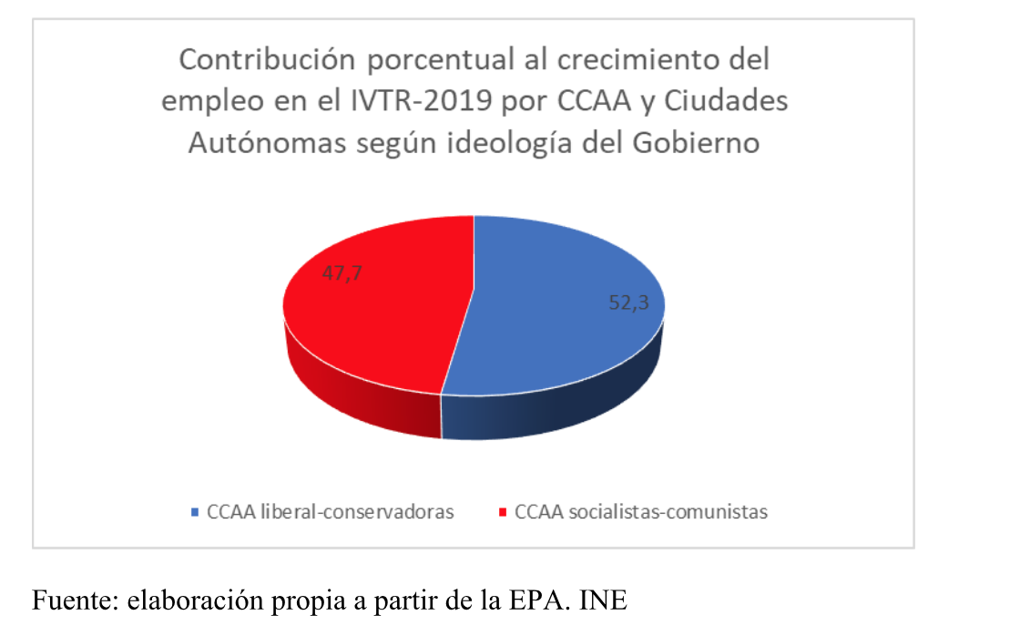 De esa manera, del crecimiento interanual de empleo en el cuarto trimestre de 2019, que fue de 402.300 empleos, más de la mitad, el 52,3%, se debe a las comunidades y ciudades autónomas donde gobierna el centro-derecha (Andalucía, Castilla y León, Galicia, Comunidad de Madrid, Murcia, Ceuta y Melilla).