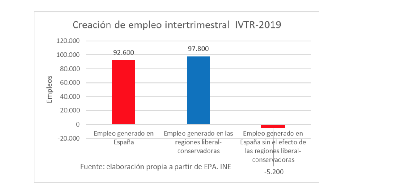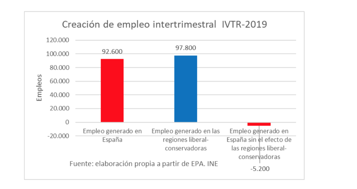 Y si tomamos los datos de evolución del empleo intertrimestral todavía es más elocuente. En el trimestre se crean 92.600 puestos de trabajo. Pues bien, el empleo generado en las regiones de ideología liberal-conservadoras es de 97.800 empleos. Es decir, el dato global de España, si descontamos el empleo generado en dichas regiones, no existiría, sino que se habría destruido empleo en el número de 5.200 empleos.