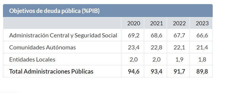 Respecto a la deuda pública, el Gobierno calcula que la ratio de deuda pública sobre PIB será del 94,6% este año, del 93,4% en 2021, del 91,% en 2022 y terminará la legislatura en el 89,8%.
