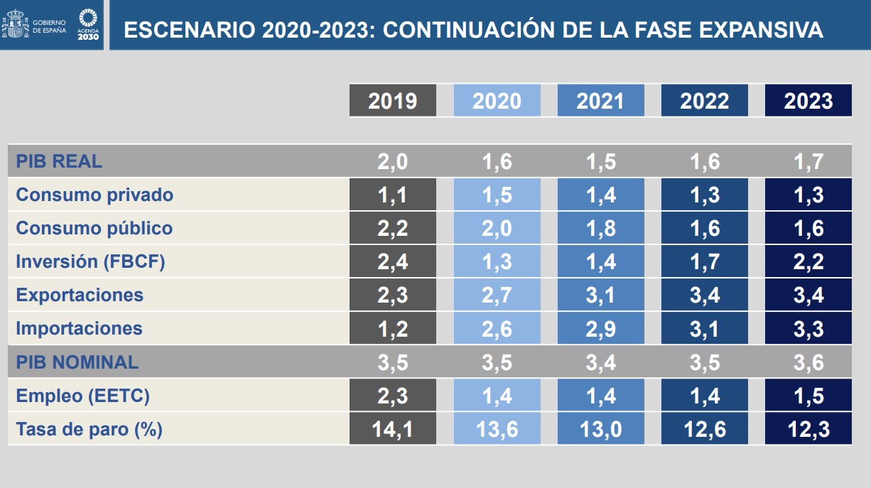 Para 2020, el Gobierno prevé un crecimiento del 1,6%, que se elevará al 1,7% en 2023, mientras que la tasa de paro pasará del 13,6% este año, al 13% en 2021 y acabará en el 12,3% en 2023, la tasa que el Ejecutivo esperaba lograr ya este mismo año.