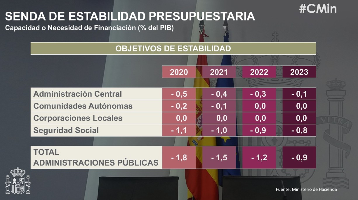 Sobre los próximos objetivos de déficit y deuda pública, el Gobierno ha decidido dar más margen a estas variables. Así el Consejo de Ministros ha aprobado elevar la previsión de déficit público al 1,8% del PIB este año y estimar un 1,5% en 2021, un 1,2% en 2020 y un 0,9% en 2023, al tiempo que estima que la deuda pública rondará el 90% del PIB al final de legislatura.