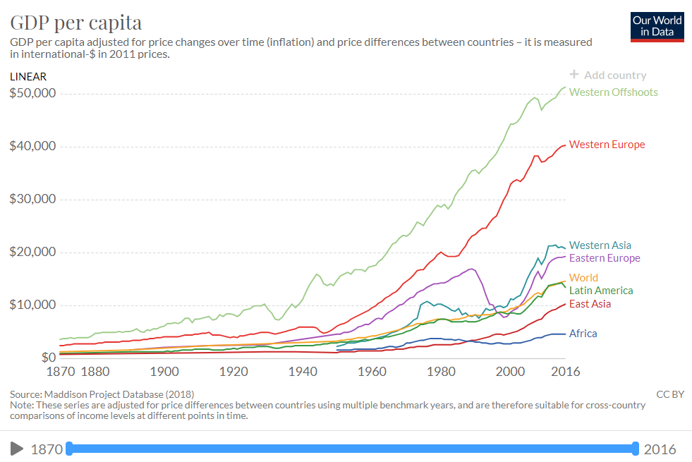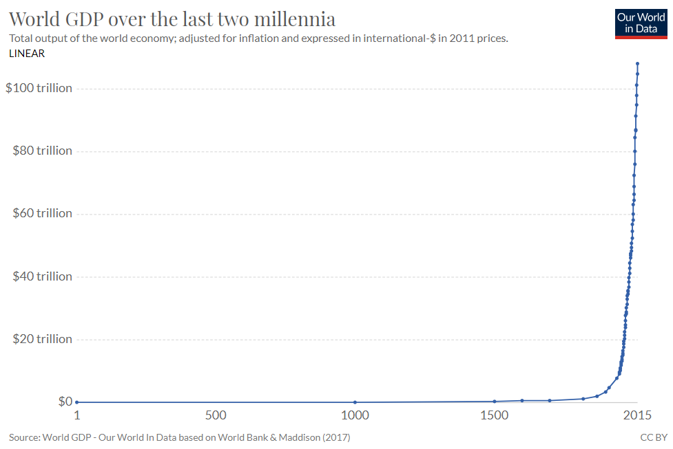 La combinación de propiedad privada, cumplimiento de los contratos (seguridad jurídica) y libertad económica en un sentido amplio es la única receta que garantiza la creación y acumulación de riqueza. Prueba de ello es que el PIB global era un auténtico páramo hasta el siglo XIX, sin apenas crecimiento alguno durante milenios.