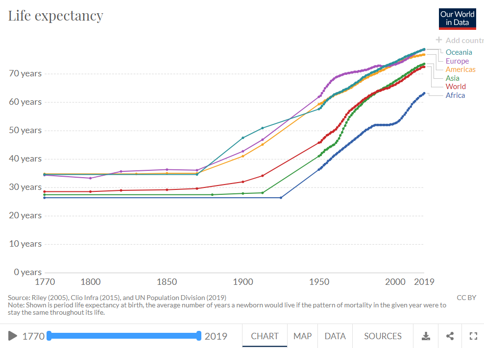 Aunque el dato más revelador y concluyente acerca de la histórica mejora que ha registrado la humanidad es, sin duda, el inédito aumento de la esperanza de vida, puesto que, durante este período, ha pasado de tan sólo 30 años en todas las regiones del mundo a una media global de 73 años en 2019, superando ya los 80 en numerosos países. Es decir, la gente vive casi tres veces más tiempo que en la época pre-capitalista.