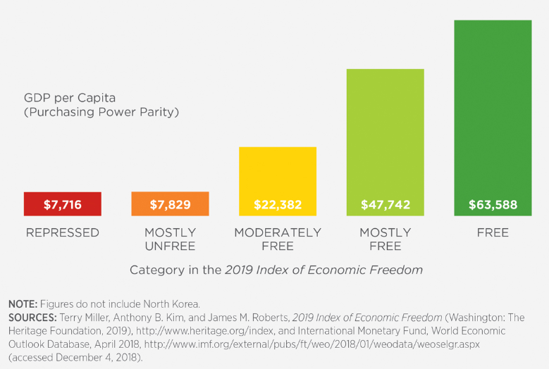 Y si el capitalismo se traduce en riqueza, su reverso, el comunismo, cosecha justo el resultado contrario. Desde el punto de vista estrictamente económico, el PIB per cápita de los países más intervencionistas no alcanza los 8.000 dólares al año de media, frente a los más libres, que se sitúan por encima de los 63.500, hasta ocho veces menos, tal y como señala el último Índice de Libertad Económica de la Heritage Foundation.