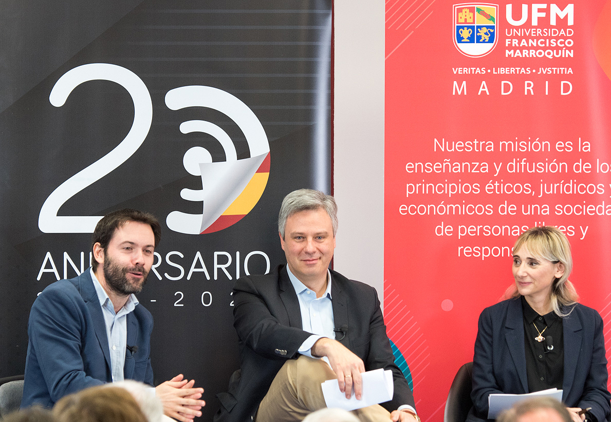 Los tres espadas del liberalismo, Daniel Lacalle, Carlos Rodríguez Braun y Juan Ramón Rallo han debatido sobre el modelo económico liberal en un acto presentado por Nuria Richart y celebrado en la universidad Francisco Marroquín de Madrid.