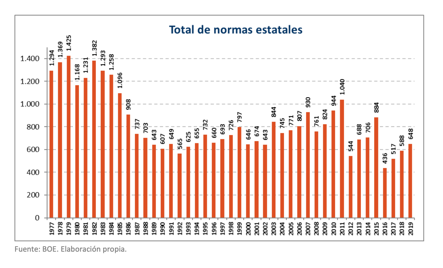 Así, el año 2016 estuvo marcado por la aprobación de 436 normas de rango estatal. Esta cifra es la más baja de toda la serie histórica, recopilada por la CEOE con datos del BOE. Por comparación, el curso 2019 se cerró con la introducción de 648 nuevas normas a nivel nacional, lo que supone cerca de un 50% más.