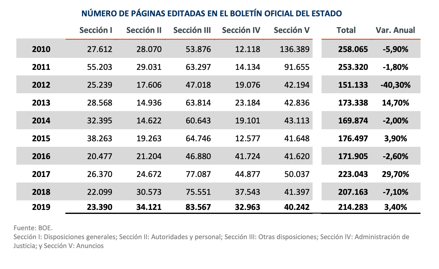 Si medimos el número de páginas editadas en el BOE, podemos ver que esta rúbrica se redujo en 2016, con una caída interanual del 2,6%, que dejó la extensión total de las normas aprobadas en el entorno de los 172.000 folios. Sin embargo, en 2019 se dio un aumento de este indicador, que subió un 3,4% respecto al año anterior, hasta alcanzar las 214.000 páginas. Comparando el año del Gobierno en funciones de Rajoy con el de Sánchez, vemos que el diferencial es de 42.000 páginas, lo que implica que los socialistas ensancharon el tamaño de la legislación vigente a un ritmo cercano al 25%.